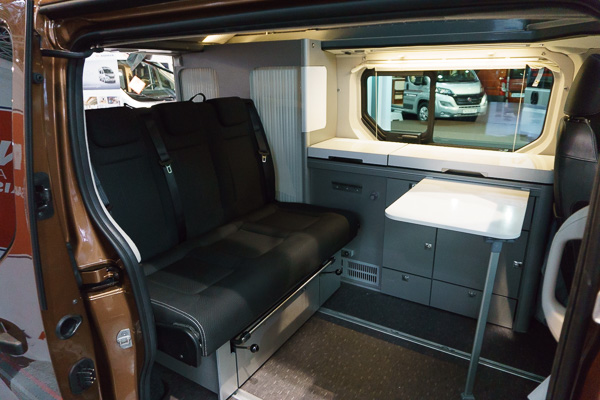 Der Campster von Pössl hat einen Citroen Spacetourer als Basis. Der Grundriss ist aber wieder klassisch mit einem Schrank hinten links, einem Küchenblock und einer verschiebbaren Schlafsitzbank. Das besondere an dem Campster ist der entnehmbare Küchenblock. Dadurch vergrößert sich die Liegefläche und man kann das Kochen und Spülen in das Vorzelt verlegen. Preislich liegt der Campster je nach Ausstattung so ca. ab EUR 40.000.-.
